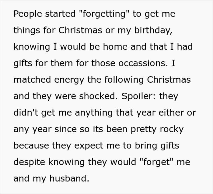 It seems like this is exactly what happened with the OP and her family because slowly they stopped inviting her to events and even “forgot” to get her Christmas gifts. When the woman realized that her loved ones weren’t even putting in a bit of effort for her and her husband, she decided to match their energy.
