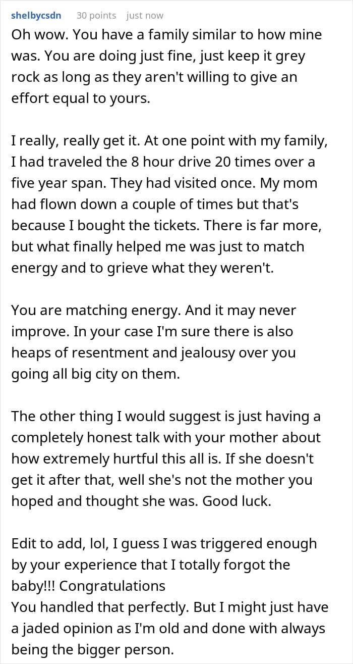 The poster probably wanted to hurt her family members as much as they hurt her, which is why she purposely shut them out of her and her baby’s life. Eventually, her mom seemed to get the message, and she tearfully tried to apologize to the OP for her actions.