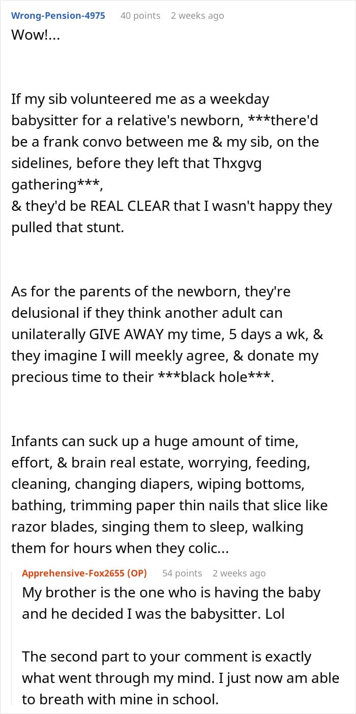 It turned out that her brother and his pregnant girlfriend expected her to babysit for them regularly – and even told other relatives this behind her back