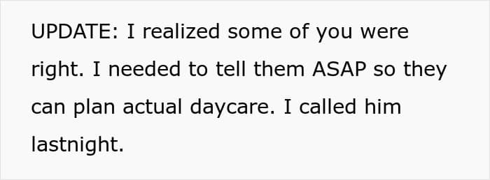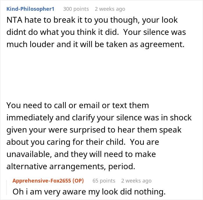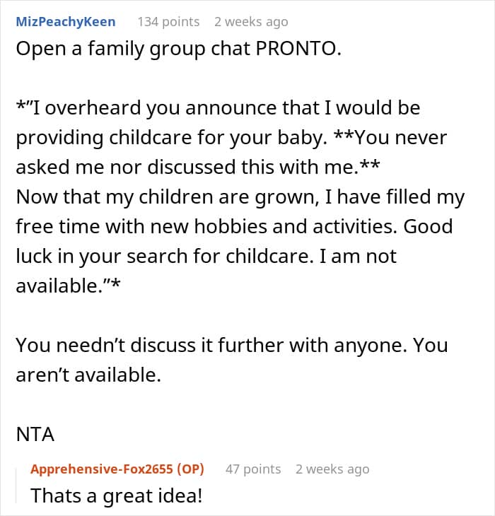But the original poster herself admits that the brother and girlfriend can hardly afford childcare. In any case, honesty is the best option, and the couple should’ve definitely talked to the OP first – perhaps she would’ve agreed. But insistence is also unacceptable here. For example, this dedicated article at Scary Mommy claims that voluntarily involved relatives are, in fact, a true gift for any parent.