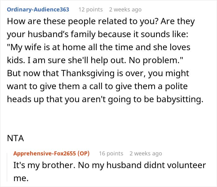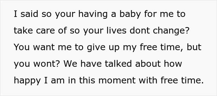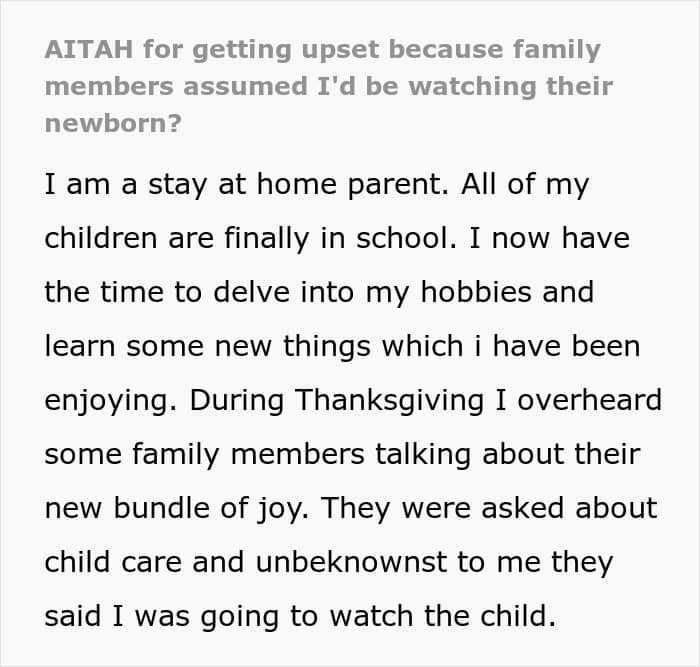Furthermore, the lady has absolutely no intention of becoming a full-time babysitter, something her brother and his partner had talked about as if it were a fact. Sure, she could easily help her bro with this from time to time (even though he’s never babysat for her), but not permanently for sure. Well, the OP also has her own hobbies that she wants to devote some free time to.