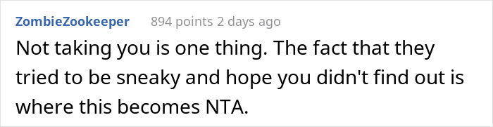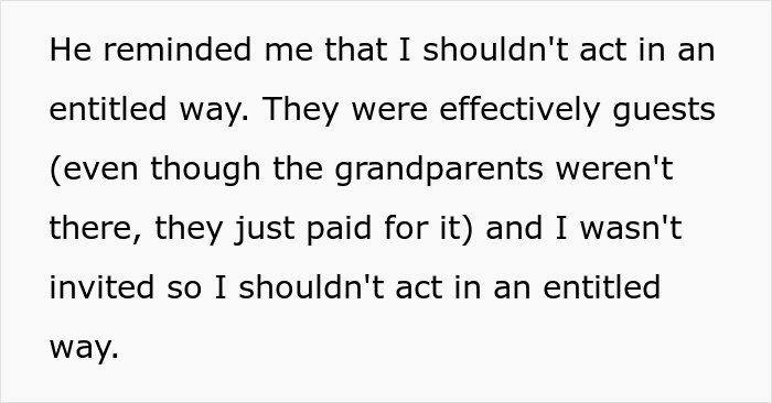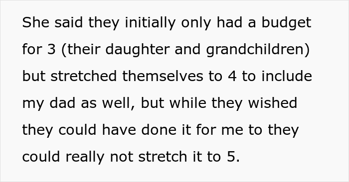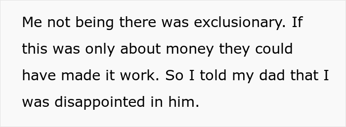 When they returned from the journey, the OP told her father that she was so upset about being not invited. However, according to the man, nothing about it was actually his decision – he said that his wife’s parents paid for the trip, and they didn’t even want him to go at first. However, the OP said that he could have paid extra for her tickets, or her mom could have. In other words, the daughter was very disappointed in her dad.