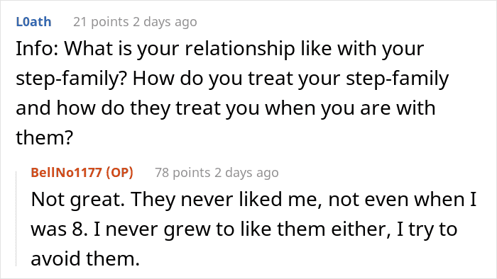 The OP raised this issue a few days later as well, when she was at her dad’s house and her stepmom’s parents came to visit them. The girl again expressed her resentment, but the father once more reminded her that the journey was very expensive and they could not afford to add one more person. The OP got even more upset and went to her room, stating that she didn’t want to ruin “their” family dinner.
