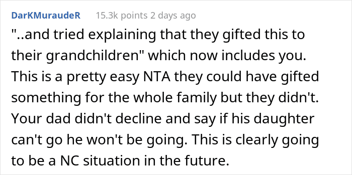 Some commenters, however, noted that, of course, OP’s father’s family acted in an ugly way – but the girl herself took the situation too personally. In any case, the grandparents have the right to manage their own money as they wish. Of course, the father did wrong, but there can be no complaints against the grandmother, people in the comments believe.