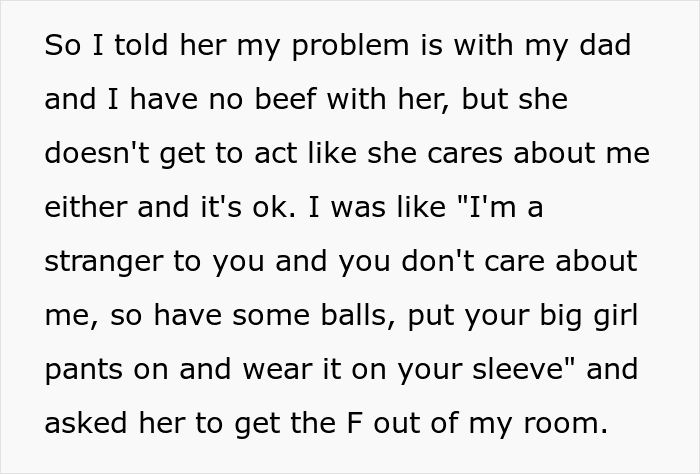 Later, OP’s stepmom’s mother came to her room and tried to explain that they wanted to pay for the trip for only three people at first, and definitely could not find money for a fifth person. The OP didn’t believe it because she knew the grandparents were very rich – so she simply stated that they were strangers and shouldn’t pretend to care about her, and generally demanded that the woman get out of her room (in a rude way).