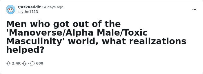 Luckily, some men do see the light eventually and break away from consuming that kind of content. Some spot the red flags almost immediately; others take some months or years to realize, “Hey, I think this is BS.” Recently, men shared these eye-opening moments in an online thread where one netizen asked, “Men who got out of the ‘Manoverse/Alpha Male/Toxic Masculinity’ world, what realizations helped?”