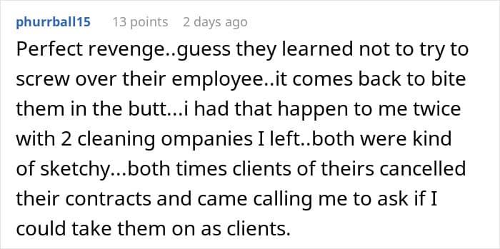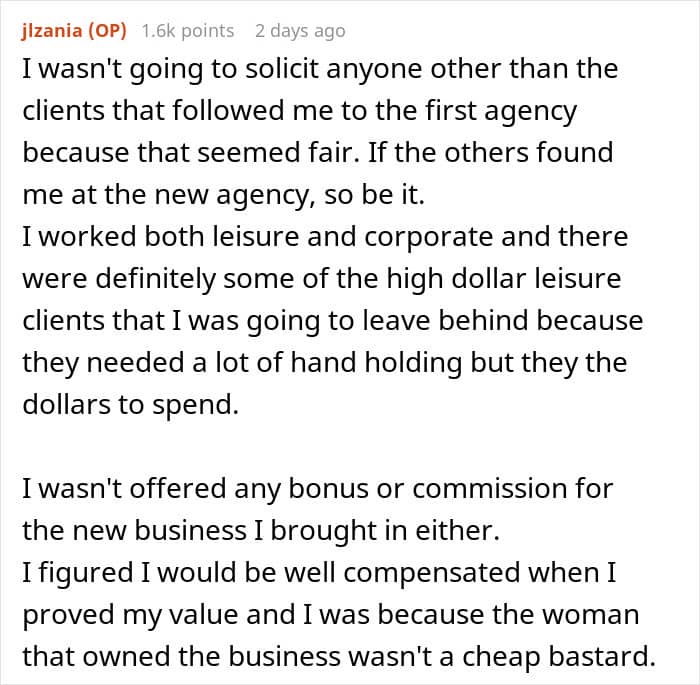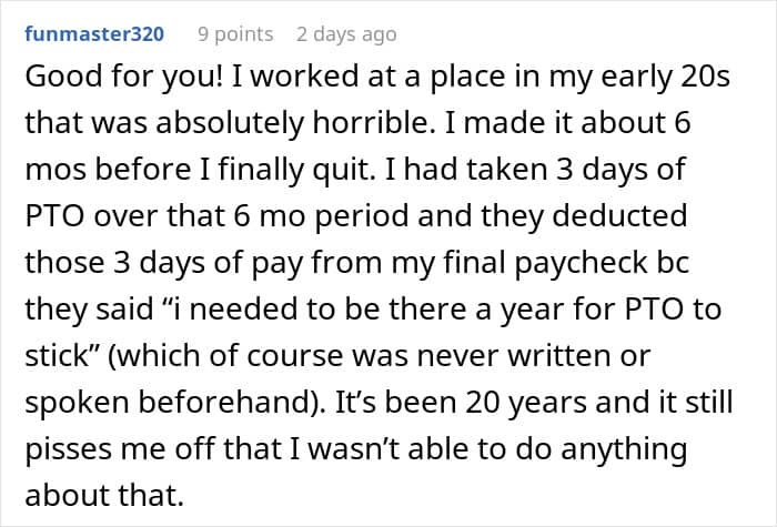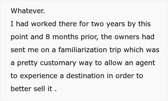 The OP decided not to bear with the managers anymore. And that’s when they showed their true colors—the stingy boss deducted money for what was a work-related trip. It wasn’t a large amount, but in a situation as such, it’s not the sum that matters. “What upset me the most was the absolute pettiness of the agency owners,” she said. “Familiarization trips were common and to attempt to ‘punish’ for quitting by deducting the $125 from my paycheck was just so small but also so typical of these people.”