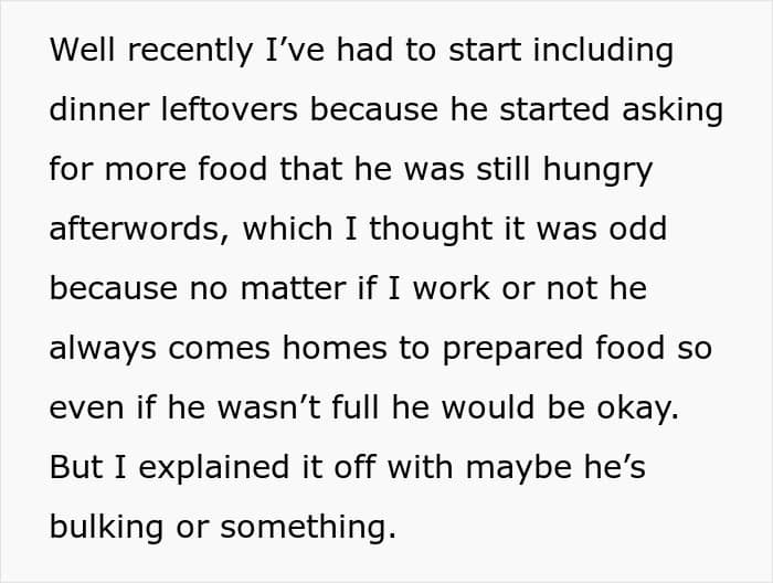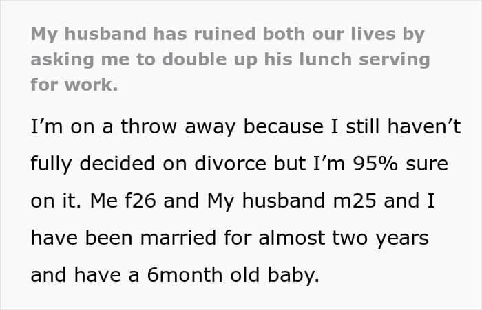 The OP gets up before her husband to prepare him breakfast and lunch for work. And then, when he returns home, a hearty dinner awaits him too. The family budget is quite limited – so when some time ago the husband asked the OP to double up the size of the lunch served for his work, she was surprised – but she tried to cut down on food for herself to provide her husband with what he wanted.