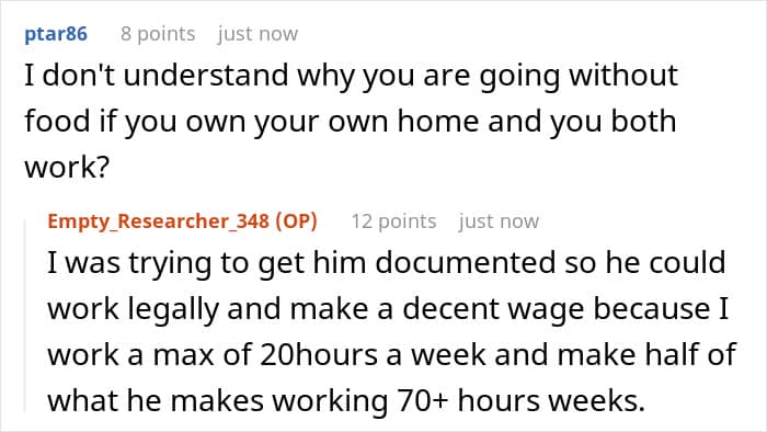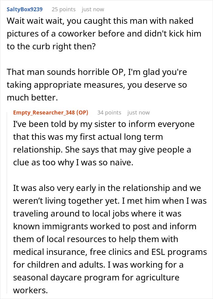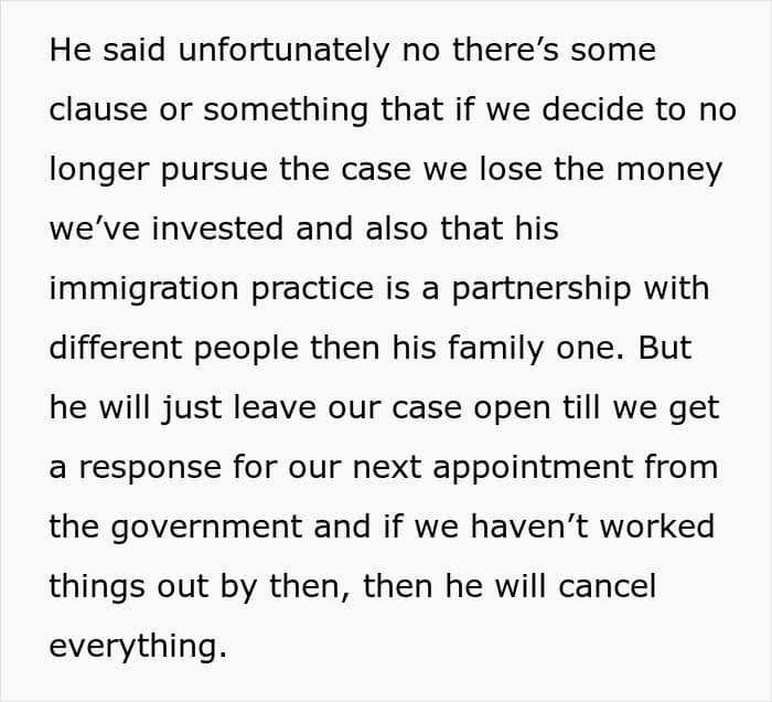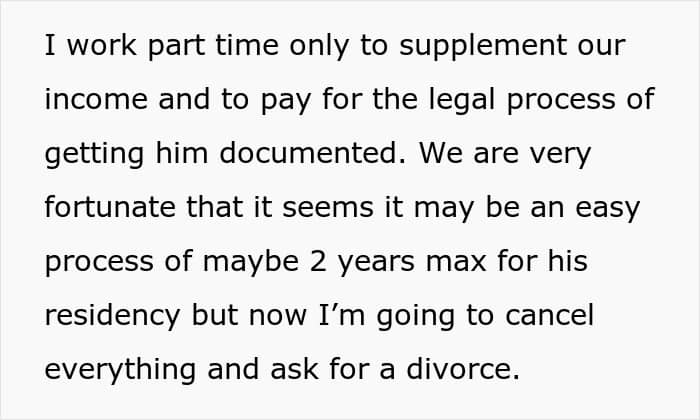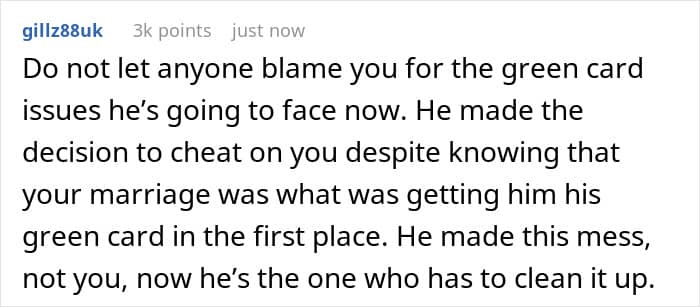 And the commenters also sincerely advised the original poster not to worry about her unsuccessful family life with this guy, because he actually chose this outcome for himself. “He made a decision to cheat on you despite knowing that your marriage was what was getting him his green card in the first place. He made this mess, not you, now he’s the one who has to clean it up,” someone in the comments wrote.