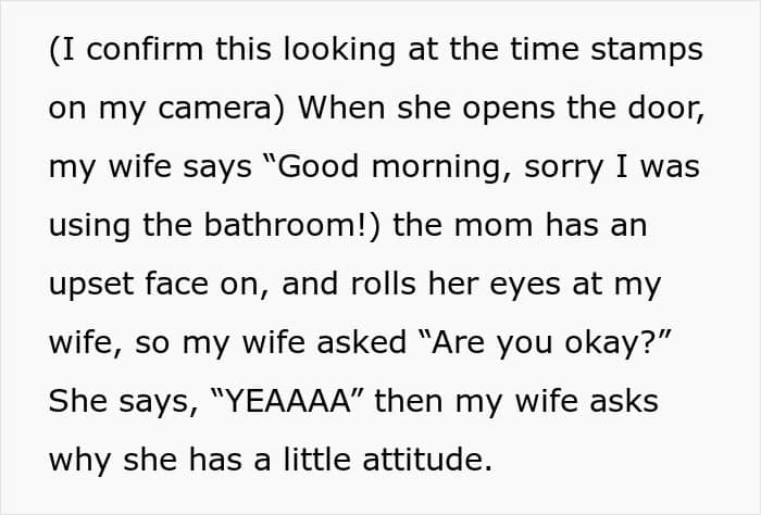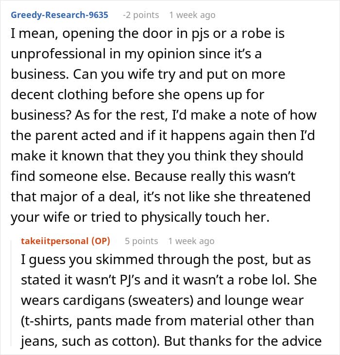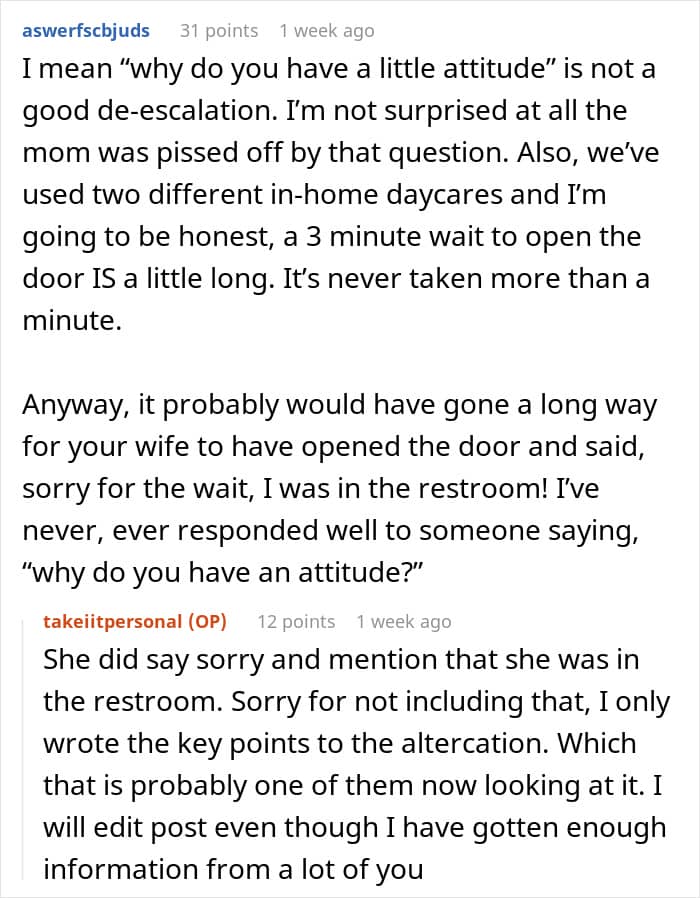 The OP explained that his pregnant wife had been insulted by a rude parent at their daycare service. The parent didn’t like that her childcare provider had opened the door 3 minutes late and said that it was apparently something she had been doing quite frequently. She also put down the woman’s dress sense, claiming that she was always in robes or pajamas.