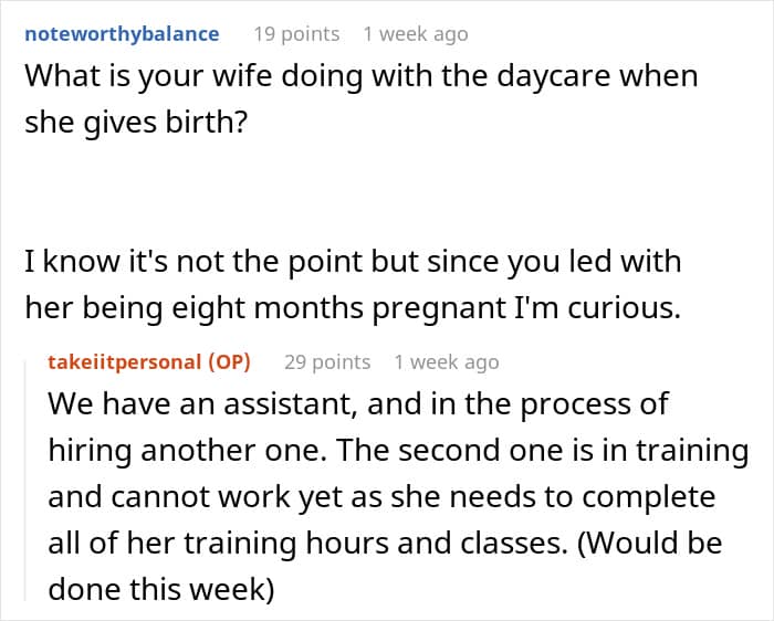 The OP also mentioned that his wife was 8 months pregnant, so she would understandably be struggling to manage bathroom breaks and her rest times. Along with that, since they were operating the childcare business from home, she probably didn’t have other staff to support her.