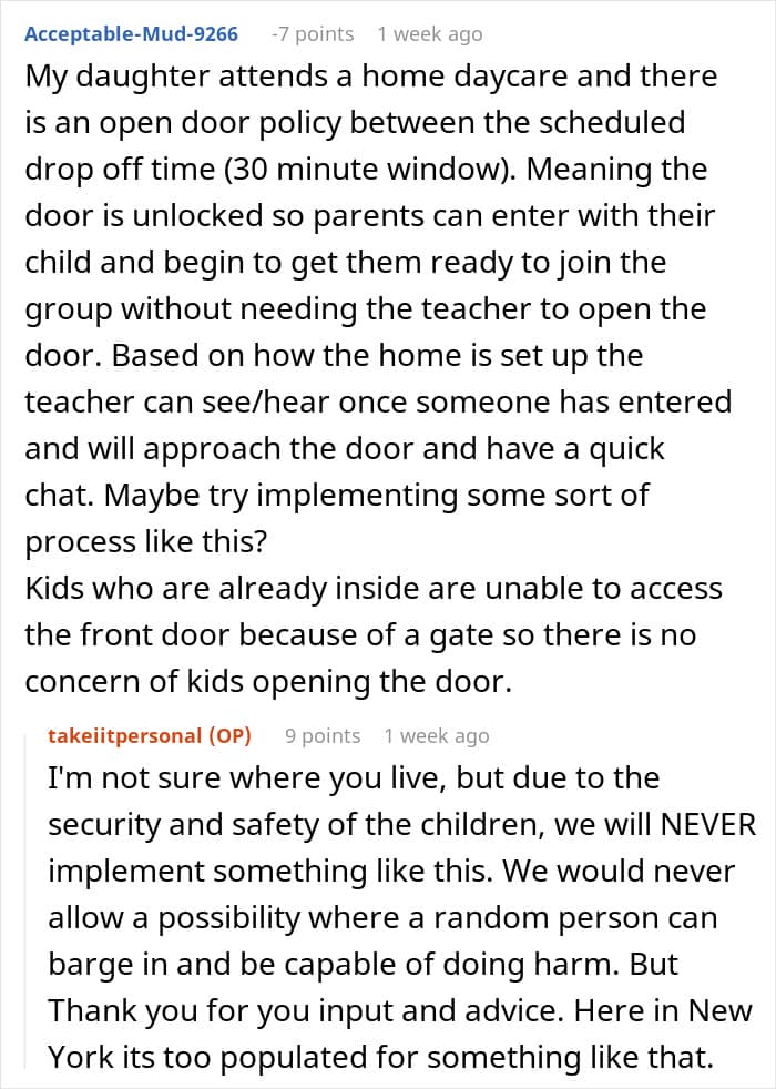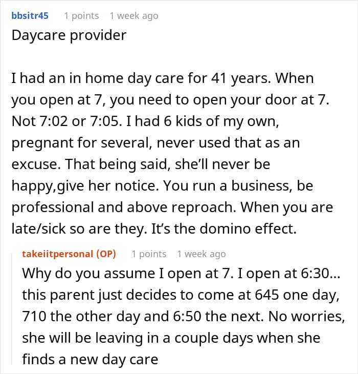 Even though the poster’s wife had tried to be polite to the parent and apologized for her delay, the rude mom couldn’t seem to accept that. That’s why the childcare couple decided to set boundaries by giving her a 14-day notice to find another place to keep her child. Although this must not have been an easy decision, it would help save them from such hassles in the future.