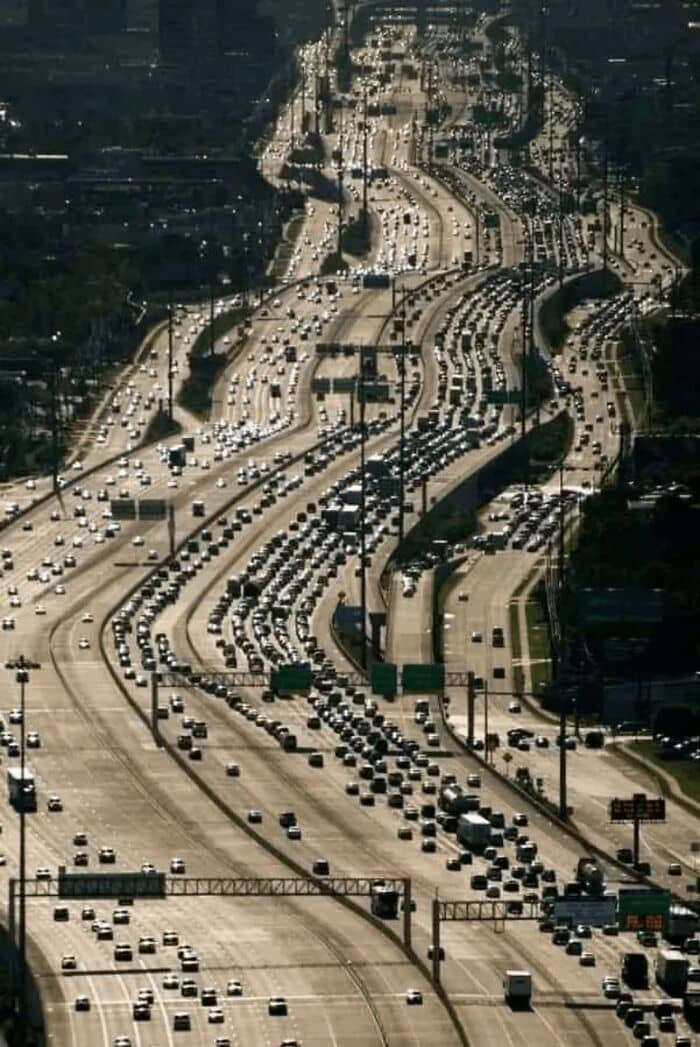The Katy freeway west of Houston. A roadway eternally under construction and attempts to solve the problem of congestion by ever widening the road. Forget mass transit, add more lanes.