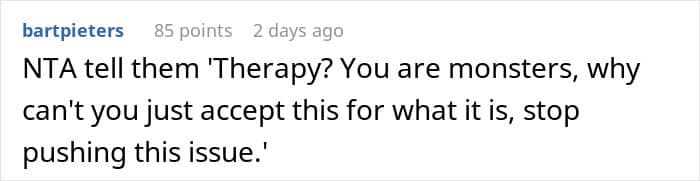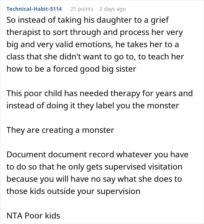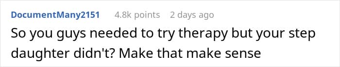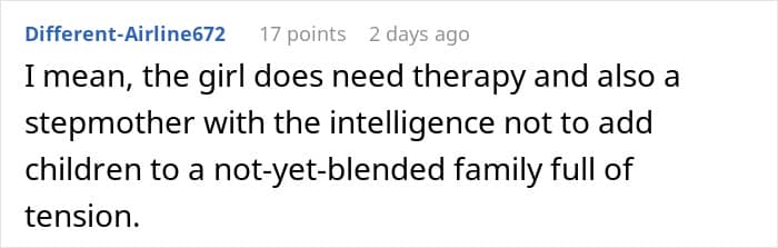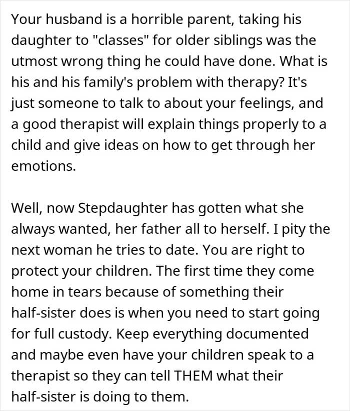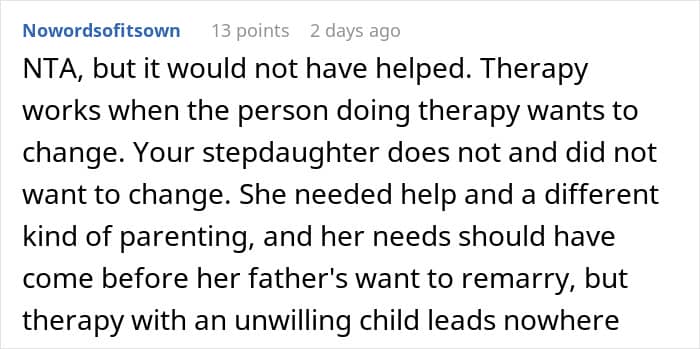 The woman recognized that her stepdaughter needed help in dealing with the pain she was likely carrying from losing her mom, which is why she recommended therapy. The hurt she felt may have manifested in her rage toward her dad’s new wife.
