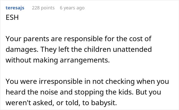 A family argument erupted afterward, with the parents expecting the author to pay for the damages despite her not being asked to watch the kids