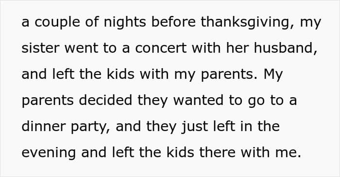 The OP’s sister and her husband came home with their two kids, ages eight and six, to spend the holiday with family. A couple of nights before Thanksgiving, the parents decided to go out to a concert and left the kids with the grandparents. Later that evening, however, the grandparents had a dinner party they didn’t want to miss.