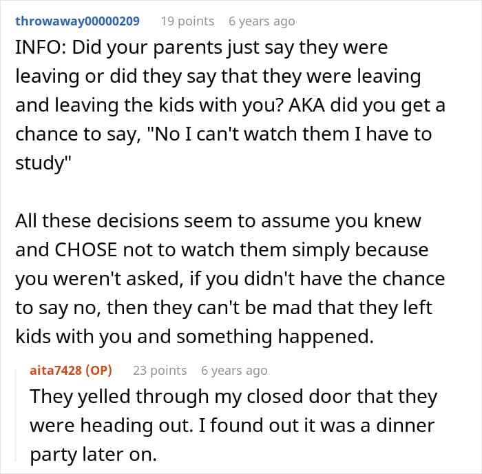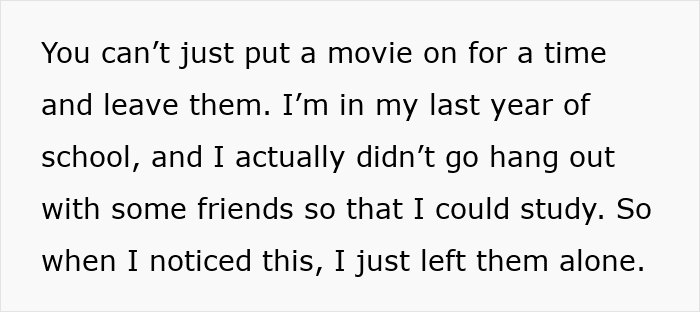 Instead of arranging childcare, they simply stepped out and left the kids in the house with the OP. According to her, she wasn’t asked to babysit, rather she was just told the adults were leaving. At the time, the OP was in her final year of school and had intentionally skipped hanging out with friends to focus on studying. So when she realized the kids had effectively been dropped on them, she wasn’t thrilled.