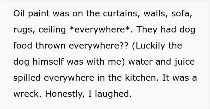 The kids, however, managed to break the television, and smear paint across walls, curtains, furniture, rugs, and even the ceiling. They also scattered dog food everywhere and spilled water and juice around the kitchen. When the parents returned and saw the damage, the OP’s mom insisted she should pay for the damages, arguing that she should have studied downstairs and kept an eye on the kids.
