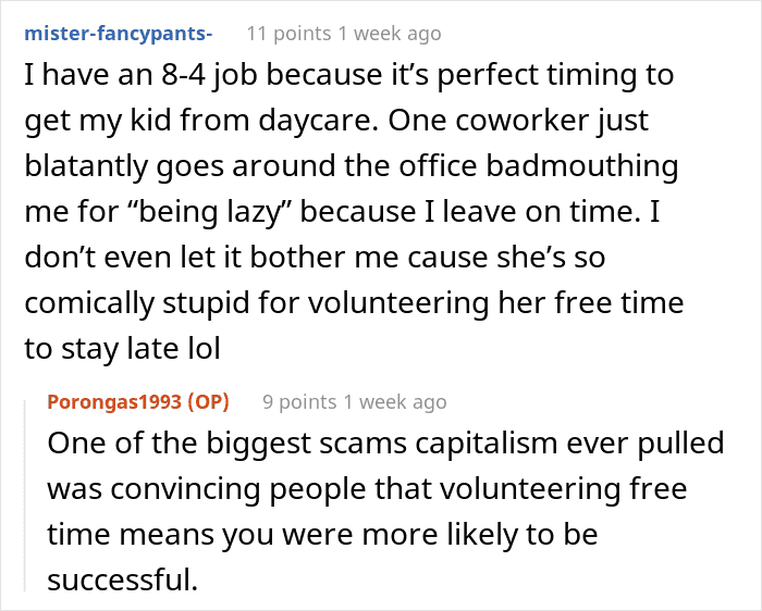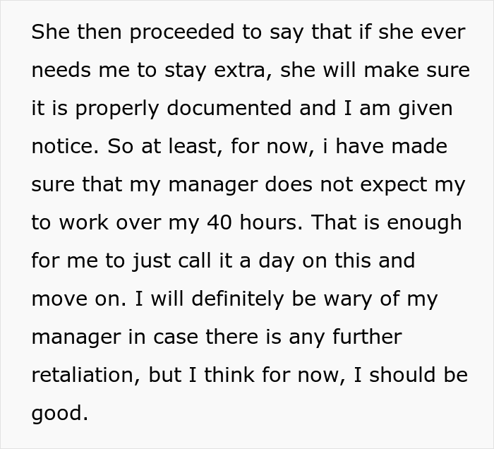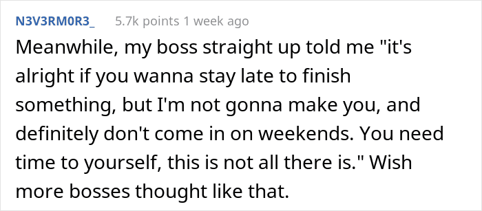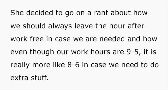 We reached out to the employee in the story, Porongas1993 on Reddit, to hear if this was the first time he had been expected to work longer hours at this job. “It’s not the first time it’s been expected, but it definitely was the first time where it was not communicated to me,” he told We. “It was also the first time it happened with this new manager, so it probably has something to do with that.” We also asked how he felt about management at his work and if this situation changed his opinion on the company. “Ever since this new manager started working here, everything has felt micromanaged and none of us like it,” he shared. “But it didn’t change my view of the company.”