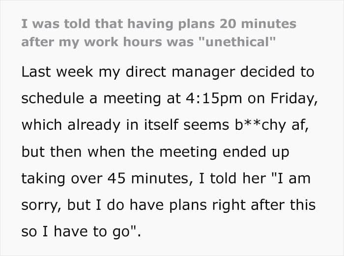 And that is exactly the point: managers owe their employees respect, and they must be up front with communication and pay their employees accordingly. In the United States, for example, employers can ask workers to put in more than their scheduled hours, as the Fair Labor Standards Act does not technically put any limits on the amount of hours employees can work per week. But they have to compensate workers appropriately. If an employee works over 40 hours in one week, they are entitled to overtime pay for all of that excess time. Of course, if a meeting runs 15 minutes past, it would not make a huge difference. But the crux of the issue is that companies need to be stringent about their rules. If they expect employees to work over their hours here and there, it can really add up. And I’m sure this manager would not be thrilled with employees showing up 15 minutes late in the mornings to make up for that time either.