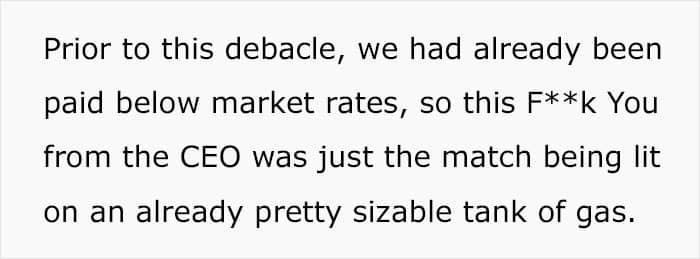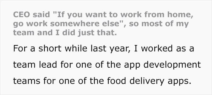 The CEO was relentless and didn’t care about their employees’ worries and suggestions. They that suggested people just leave the company if they like working from home, so much as it will not be happening there. Little did they know that the workers would take that to heart.