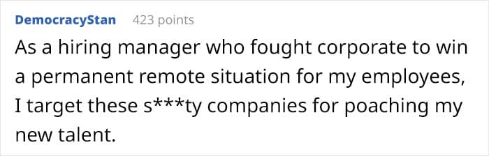 But employees got used to working from home, not needing to commute or sit surrounded by colleagues, so if they are being forced to return to the office, they just quit. As this Redditor and his colleagues did when they were presented with a plan of getting rid of remote work.