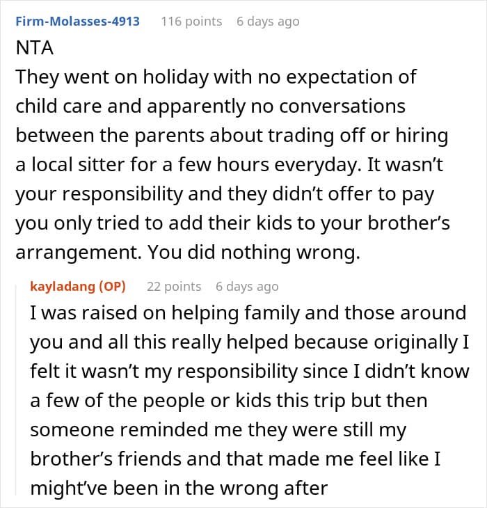 This woman recently shared how her brother’s friends tried to take advantage of her on their group vacation by leaving their kids with her without really asking. She wasn’t going to give in so easily, presenting them with a hard no, which inevitably caused tension for the duration of the trip.