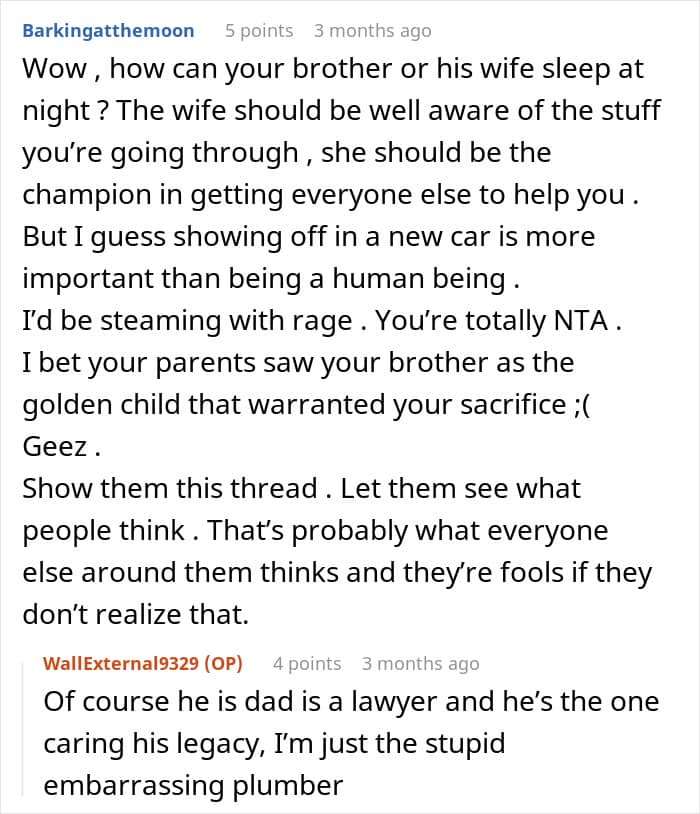 Netizens expressed support for the OP, empathizing with his physical and emotional suffering while criticizing the lack of family support. They also encouraged seeking help, both medically and socially. What do you think about this situation? Do you think family members have a responsibility to support someone who sacrificed so much for them? We would love to know your thoughts!