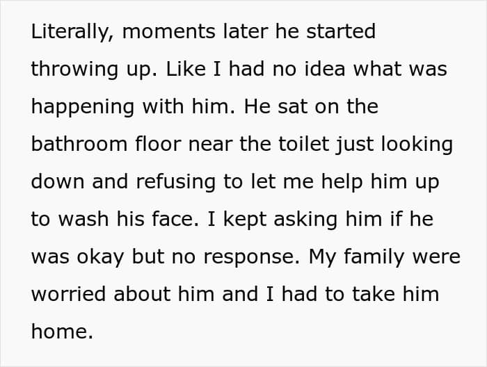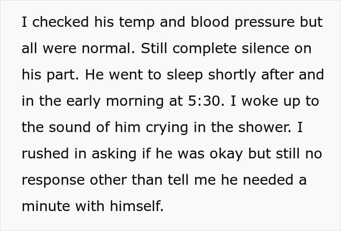 The OP explained how her husband behaved in detail. He didn’t get up to congratulate his sister-in-law during her pregnancy announcement. He threw up at dinner. He didn’t communicate much. He was crying in the shower. And he refused to talk to his wife about what was happening.