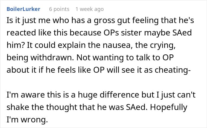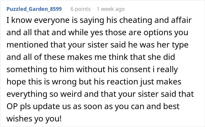 Another thought that didn’t give the redditor peace was that her sister had once implied that her husband was “her type and hoped to get someone like him.”