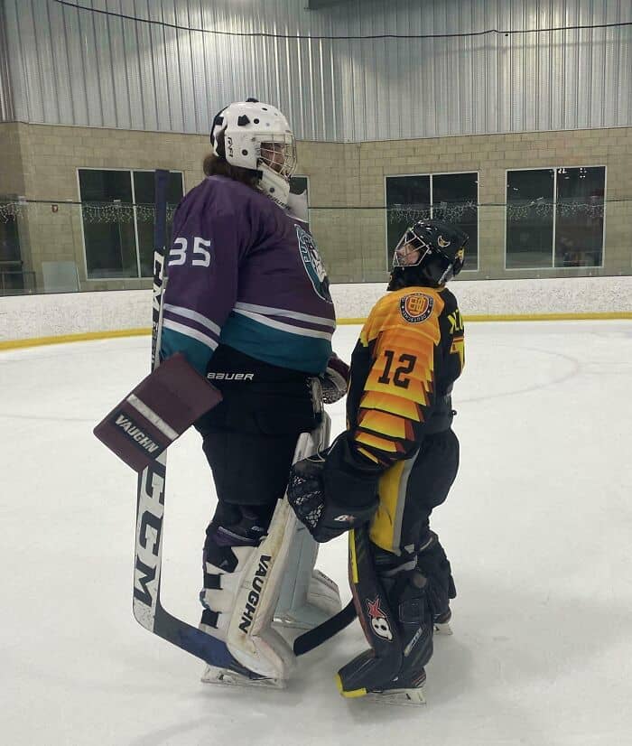#23 The Size Difference Between Me And My Opposing Goalie The Other Night. I’m 5’3 W/O Skates And He’s 6’7 W/O Skates