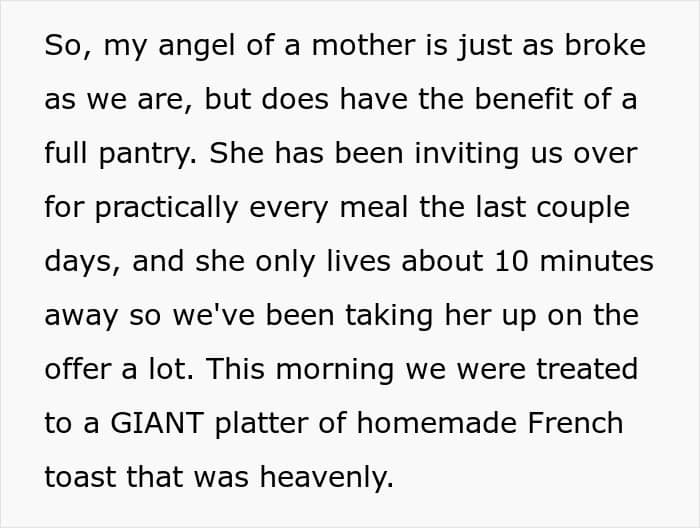 The wife chose not to escalate the argument, finished her dinner, put the kids to sleep, and went to bed herself. “The next day was payday for me, and I spent every cent of my check on deposits for an apartment for me and my boys,” the woman detailed.