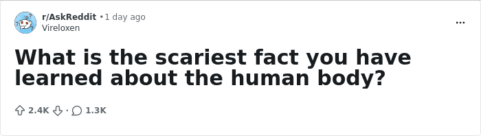 One Redditor asked users to share the scariest facts they’ve discovered about the human body, and people delivered with some genuinely unsettling answers. If you’re curious, scroll down to see what they shared. There’s a good chance you’ll learn something new—you just might wish you hadn’t.