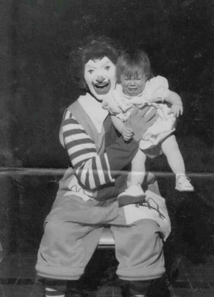 #22 An Early Version Of Ronald Mcdonald Photographed Alongside A Crying Baby
