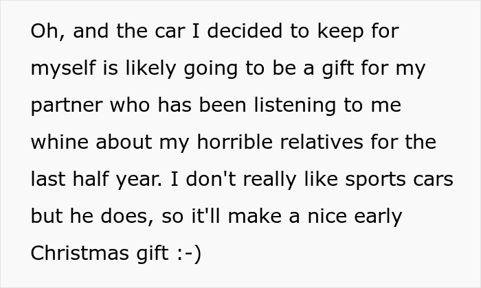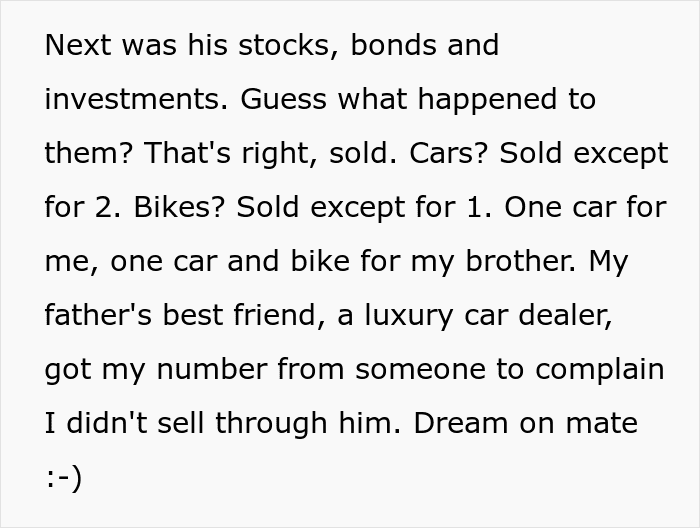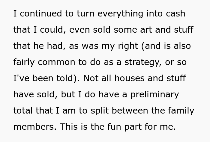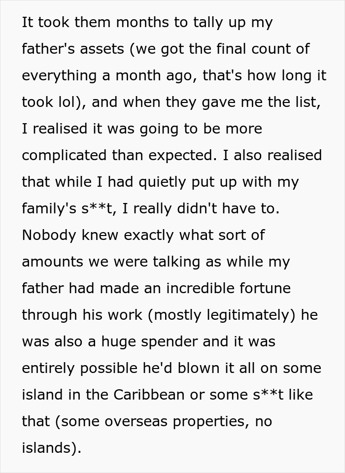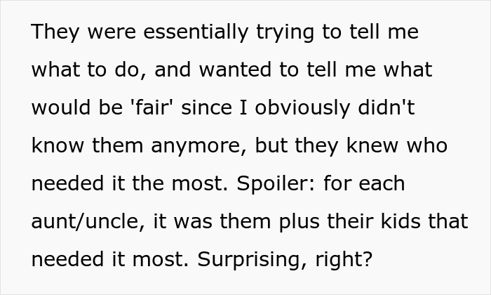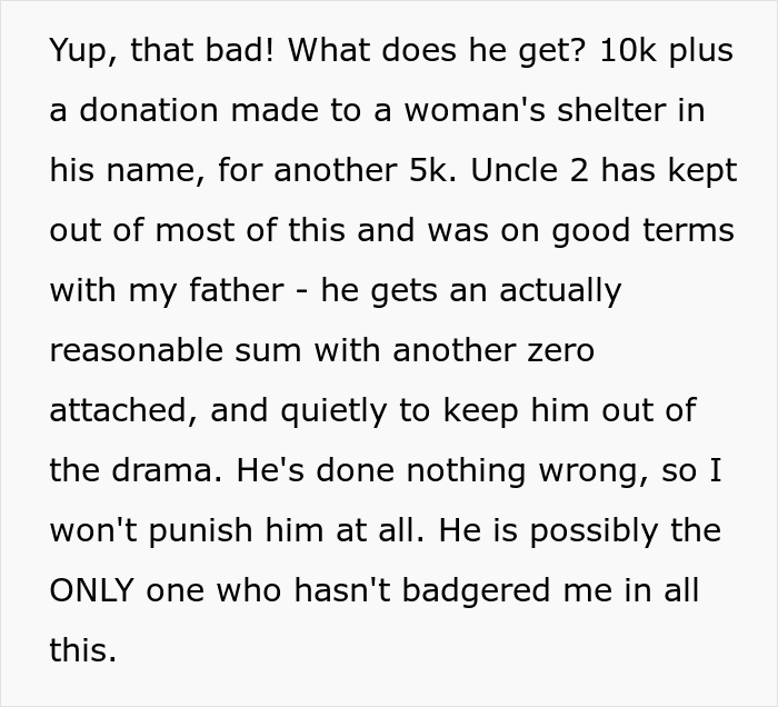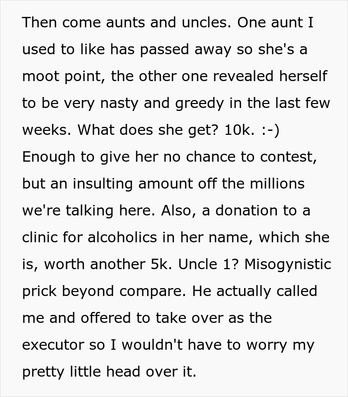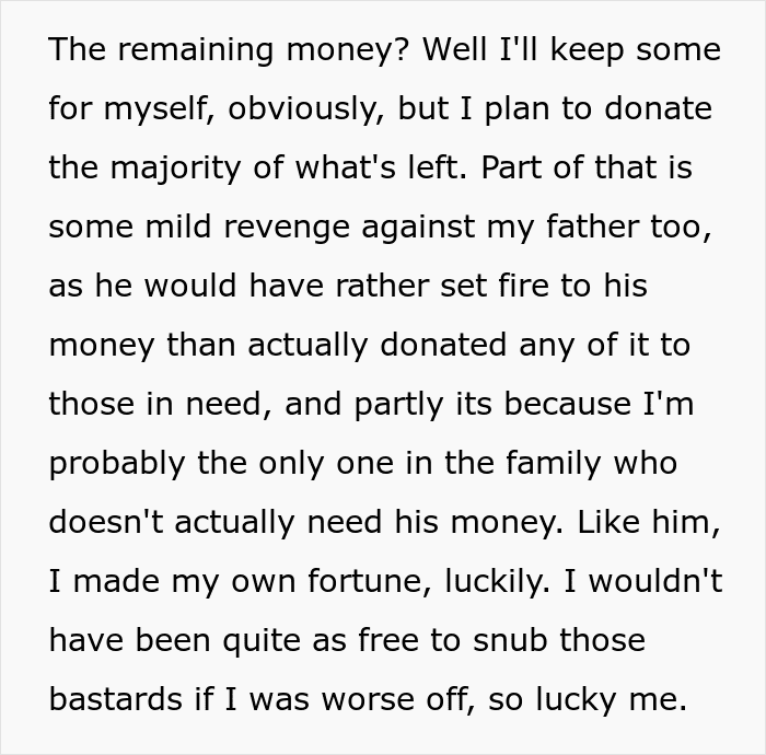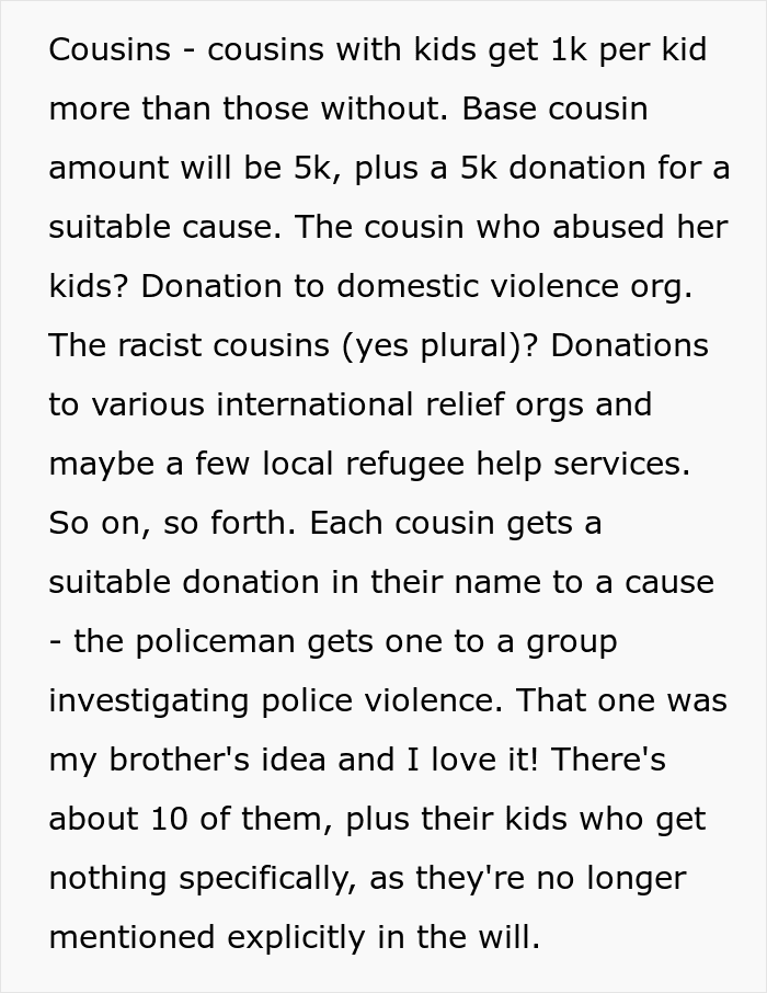 Her aunts, uncles and cousins received pathetic amounts if you compare them with the millions they could have got. The OP also had an idea worthy of a chef’s kiss as she donated money in the name of her relatives to charities that are completely opposite to what they stand for. For example, if they were an alcoholic, she would donate to a clinic for alcoholics, if they were misogynistic, they would donate to a women’s shelter etc.