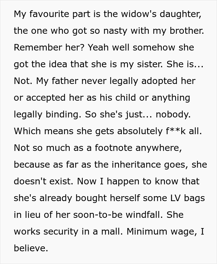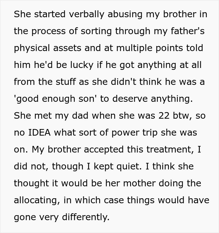 Because the OP didn’t like her and because she was really mean to her brother, the woman decided the widower’s daughter would get nothing. She was 22, so the deceased didn’t adopt her, so technically she was just a random stranger.
