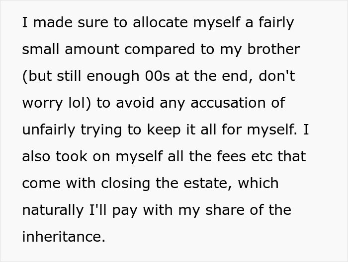 As for the rest of the money, she will be taking a piece for herself, although not as big of a chunk as she gave to her brother, because she has enough of her own money. The woman plans to donate the remaining money to various charities she is already familiar with because she knows her father wouldn’t want that.