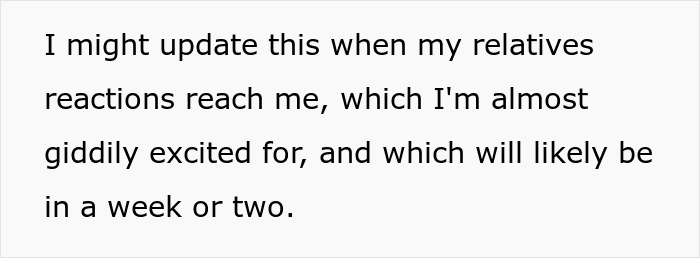 The relatives don’t yet know about the woman’s decisions on their inheritance as she just sent out the letters and it will take about two weeks to get to them. ThatsDrAardvarkToYou thinks she might do an update on their reactions, but for now, we wait.