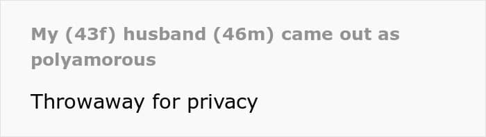 The poster explained that she had been married to her husband for fifteen years and that he suddenly “came out” as polyamorous, and already had someone to date