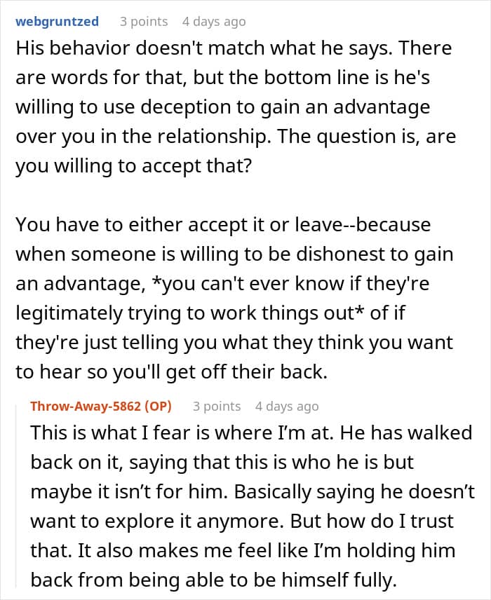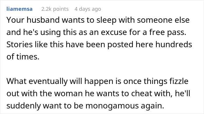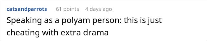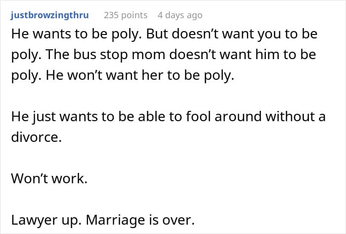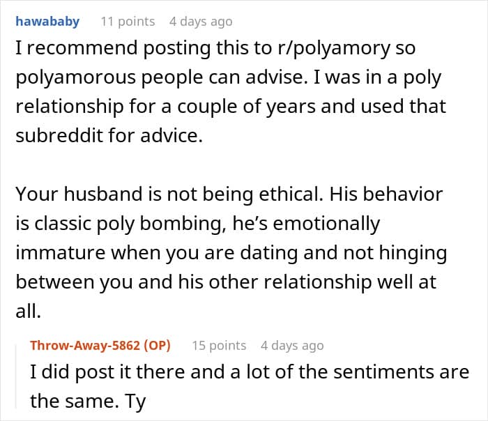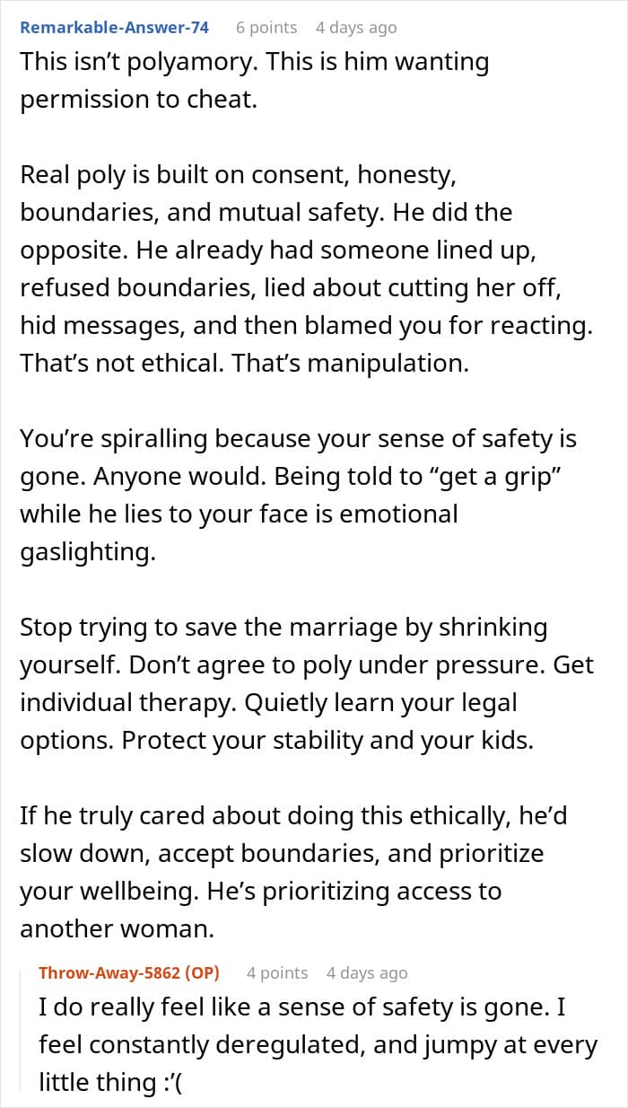 Folks sided with the woman and told her that her husband was just using polyamory as an excuse to cheat on her