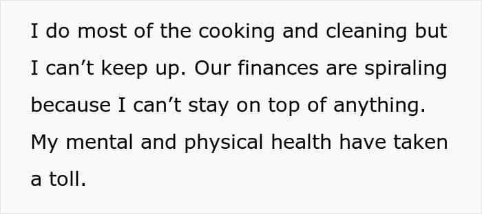 In this case, though, the woman still wanted to hold onto her marriage despite her husband’s red-flag behavior. Apart from this, she was also managing the finances of their family, and clearly, having to face all this on her own was taking a toll on her mental health, which is why she asked folks online for advice.