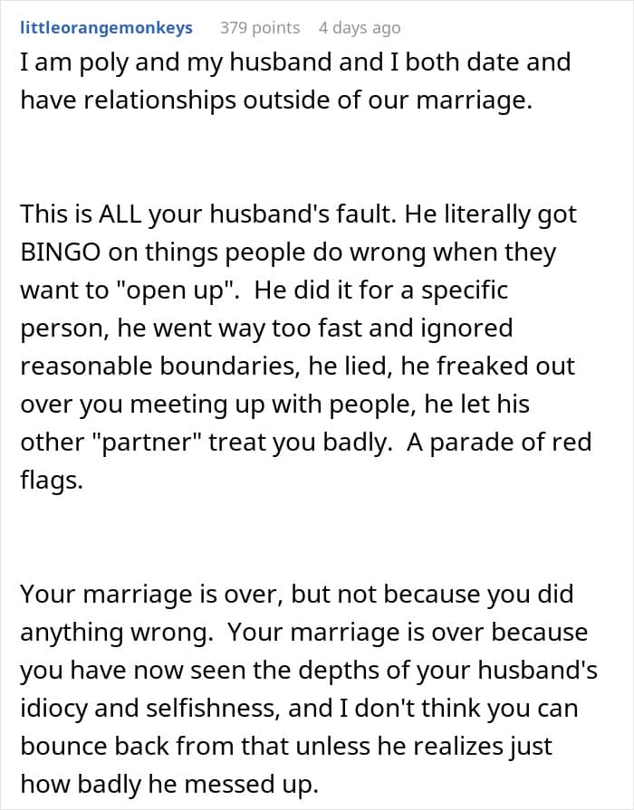As the poster mentioned, she and her husband had been together for more than a decade and had two children. Nothing seemed off about their relationship, and they faced the normal ups and downs of life. That’s why she was shocked when he suddenly decided that he wanted to be polyamorous.