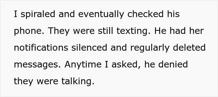 Eventually, the OP began to feel insecure about how much her partner was fawning over their neighbor, and she told him to delete her number. The problem is that the man still secretly kept in touch with the other woman, and his wife only noticed because of how suspiciously he was acting.