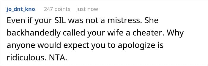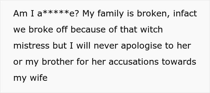 He and his wife left immediately, unwilling to entertain the humiliation. Later, his brother demanded an apology from the OP and that didn’t go over well when he strongly refused. Now, the family is fractured, but he stood by his choice, refusing to apologize for defending his wife’s honor.