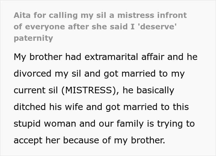 The OP explained that his brother had divorced his first wife and married the woman he cheated with, now making her his current sister-in-law. The family, trying to keep things civil, has been awkwardly adjusting to this new reality.