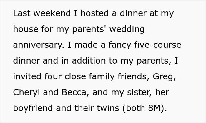 Recently there was an occasion for the family to gather as the OP’s parents were celebrating their wedding anniversary. Besides the parents, the woman invited close family friends, her brother, her brother’s wife, the wife’s daughter from her previous marriage, her sister and the sister’s family.