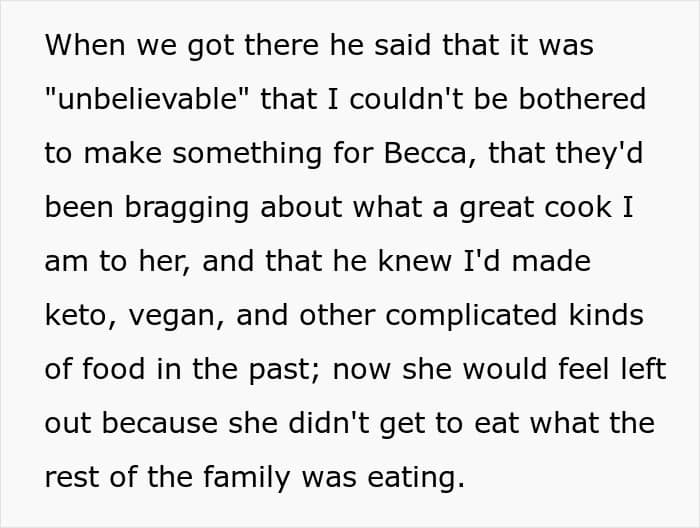 The brother was so angry that the sister couldn’t even say a word and explain that she thought this was the safest way to serve Becca dinner. He was worried about how disappointed Becca would feel as he and his wife were praising how well her step-aunt can cook.