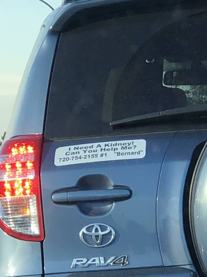 #64 This Person Has A Bumper Sticker Trying To Help Them Find A Kidney