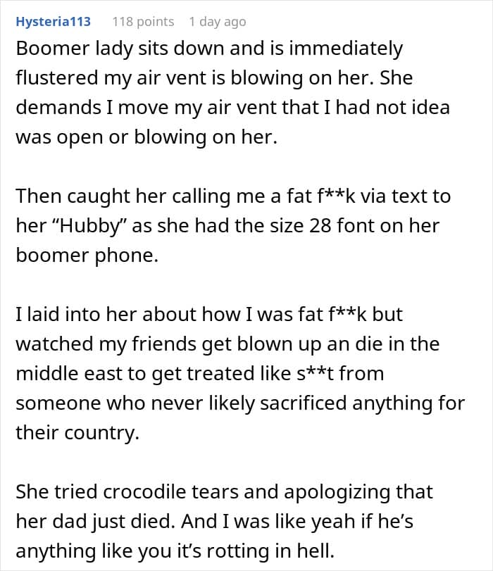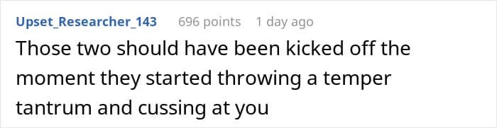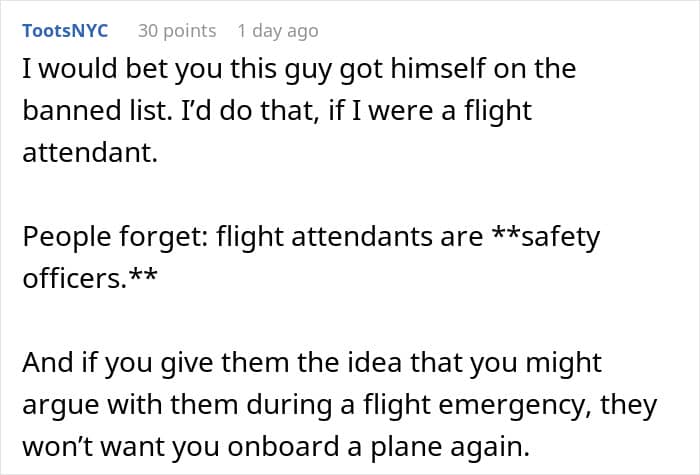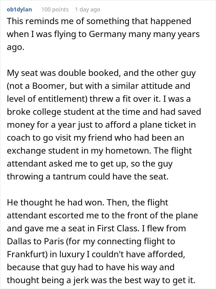 “There should never be a public outburst, profanity or physical violence on an airplane,” said Gottsman when asked about her thoughts on the OP’s post. “If you are really unhappy with your seat, and there is no way to change it, rather than an outburst which will end up on social media, either take a seat or opt for another flight. Common courtesy, and understanding are always the best options when dealing with strangers, friends, and family members.”