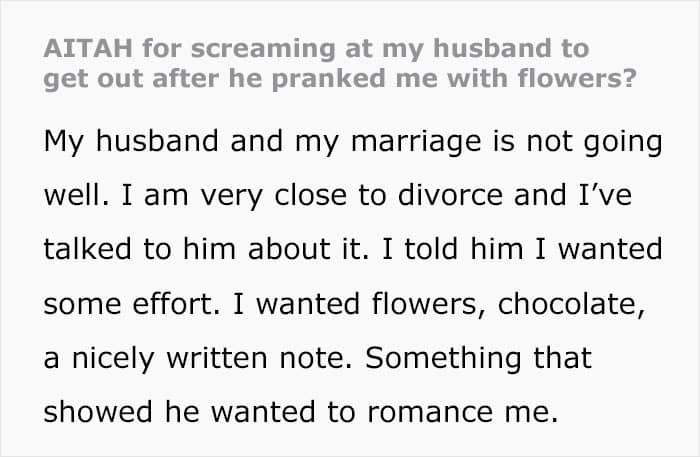 So when this woman’s husband spent energy on pranking her instead of spoiling her, she knew their marriage was over
